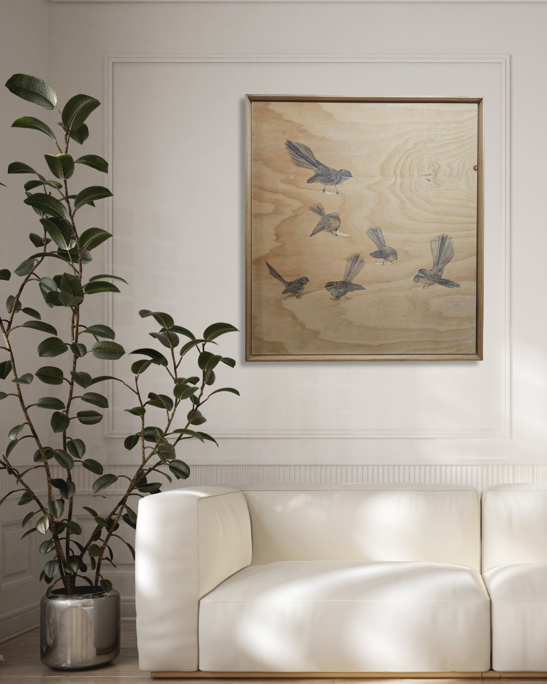Pīwakawaka the Messenger forms part of Anna Scott’s contemplative In the Grain series — a body of work where the natural grain of the timber leads the creative process. Rather than imposing imagery onto the surface, Anna works in harmony with the wood, allowing its patterns, movement, and energy to guide the composition. The grain becomes both canvas and collaborator, revealing forms that feel as though they have always belonged there.