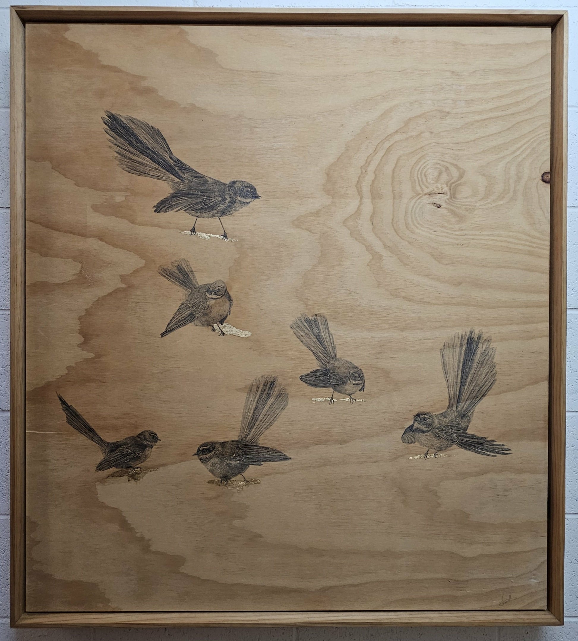 In Pīwakawaka the Messenger, a cluster of pīwakawaka appear to dance across the wooden surface, their lively movements mirroring the playful, yet purposeful, presence they carry in the ngahere. Traditionally viewed as messengers and guides between realms, the pīwakawaka dart effortlessly between Te Ao Wairua (the spiritual world) and Te Ao Tūroa (the natural world), returning kōrero, impressions, and connections from our gaudians.