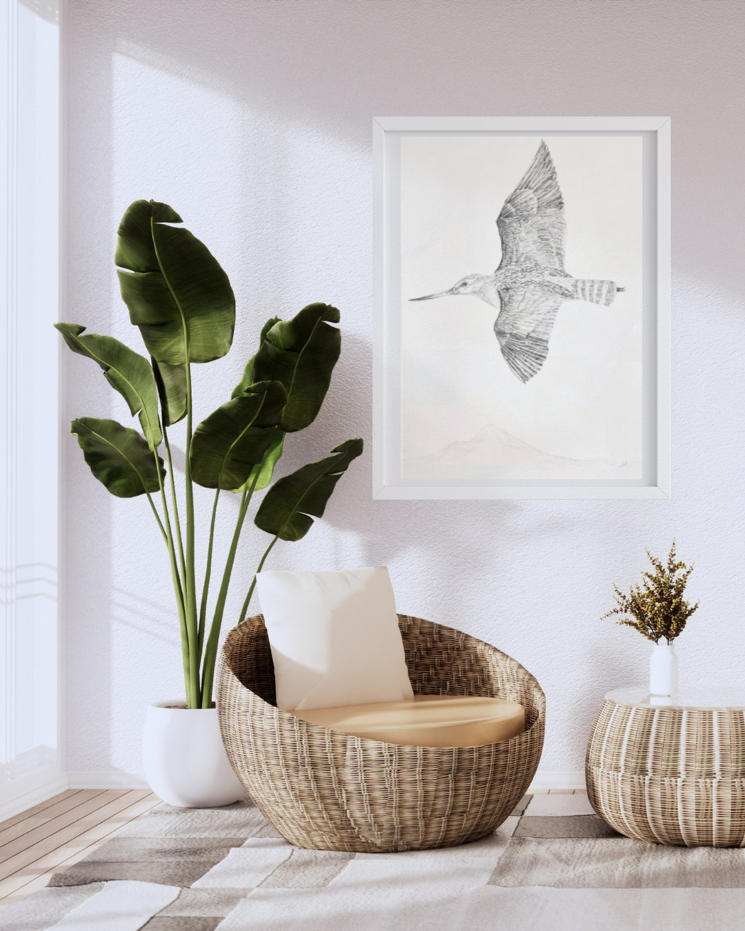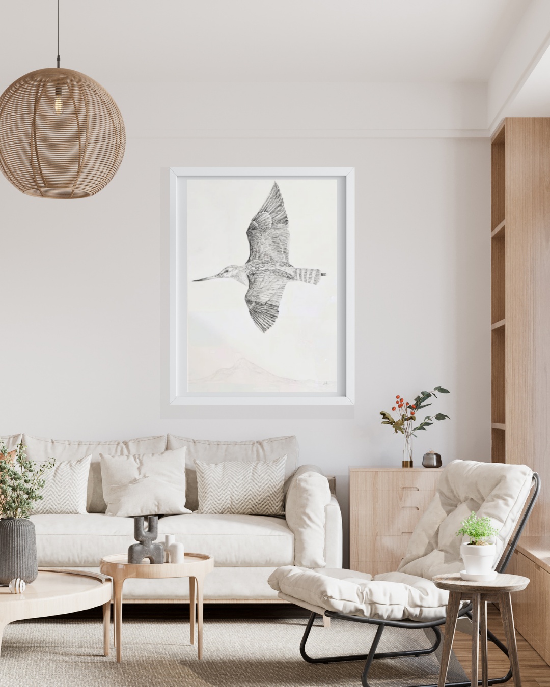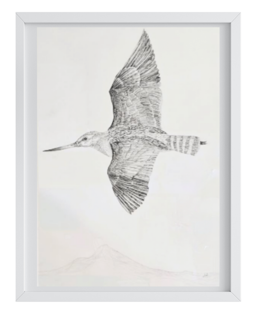 This pencil drawing explores the physical, emotional, and spiritual dimensions of what it means to return home. At its centre is the Kuaka (Godwit), a remarkable migratory bird known for its record-breaking journey from Alaska to Aotearoa. Its endurance, purpose, and instinctive pull toward home mirror our own search for belonging and the profound relationship we share with the land.